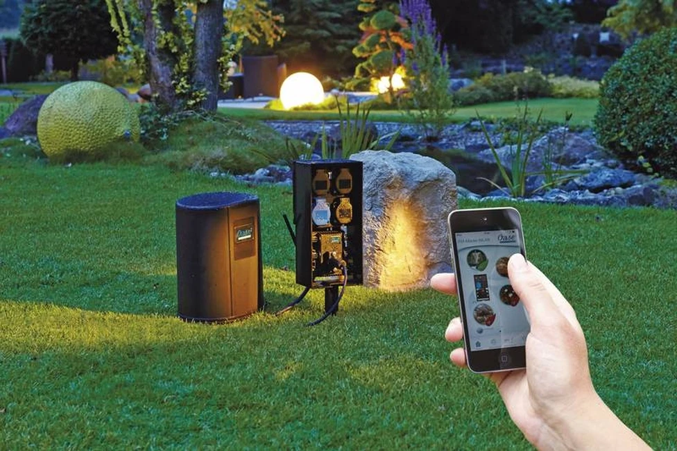 Dit is een innovatief product van Oase, deze stroomvoorziening kunt u toevoegen in de tuin en bedienen met uw smartphone.